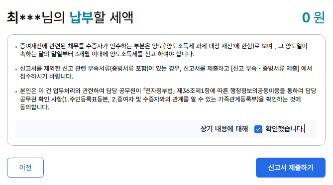 미성년 자녀라면 '직계존비속' 항목에 2,000만 원을 입력해야 실질적으로 납부할 세액이 0원이 됩니다.