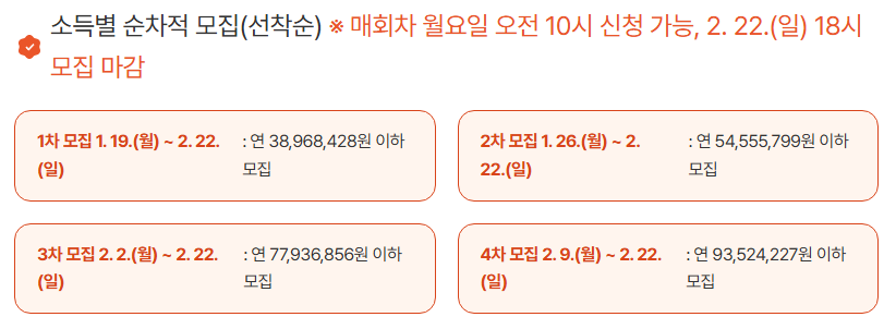 모집 기간은 1월 19일부터 2월 22일까지이며, 소득 구간별로 4단계로 나누어 순차 접수합니다.