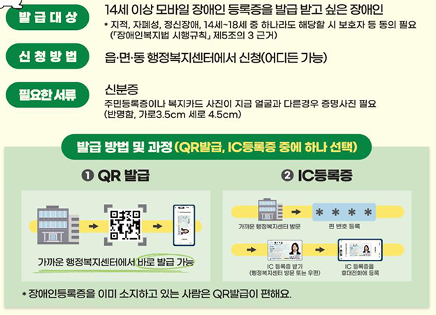 발급 방식은 두 가지로, 담당자가 제공하는 QR코드를 촬영해 즉시 발급받는 방법과 IC칩이 내장된 장애인등록증을 스마트폰에 접촉해 등록하는 방식이 있습니다.
