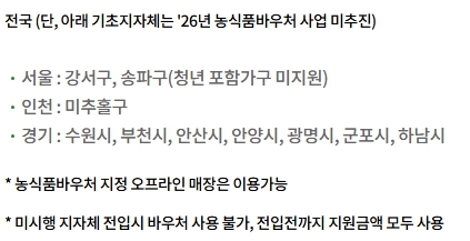 가공식품이나 비식품은 구매할 수 없습니다. 사용처는 전국 지정 오프라인 매장과 온라인몰이며, 거동이 불편한 이용자를 위해 매월 꾸러미 배송 방식도 운영됩니다.