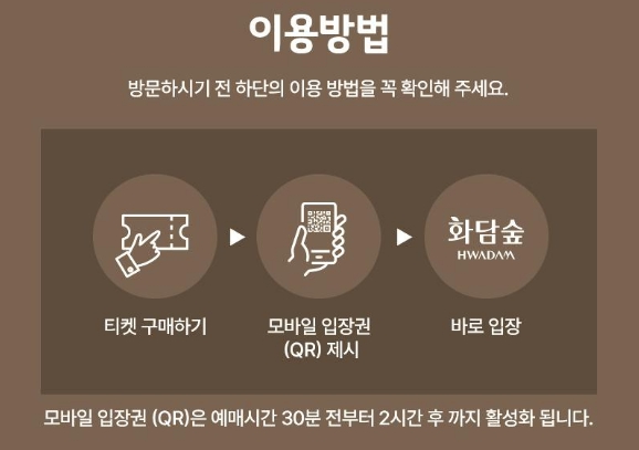 화담숲은 현장 발권이 불가하며, 입장권은 홈페이지 또는 NOL 앱을 통해서만 예매할 수 있습니다. 예약 완료 후 문자로 발송되는 QR코드가 입장권 역할을 하며, 별도의 티켓 교환 절차가 없습니다.