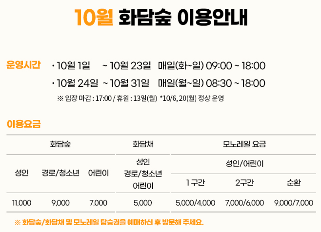 화담숲은 생태환경을 보호하기 위해 유료 입장제를 시행하고 있습니다. 또한 모노레일을 이용하면 오르막 구간도 편하게 이동할 수 있어 어르신이나 어린이 동반 가족에게 인기 있습니다.