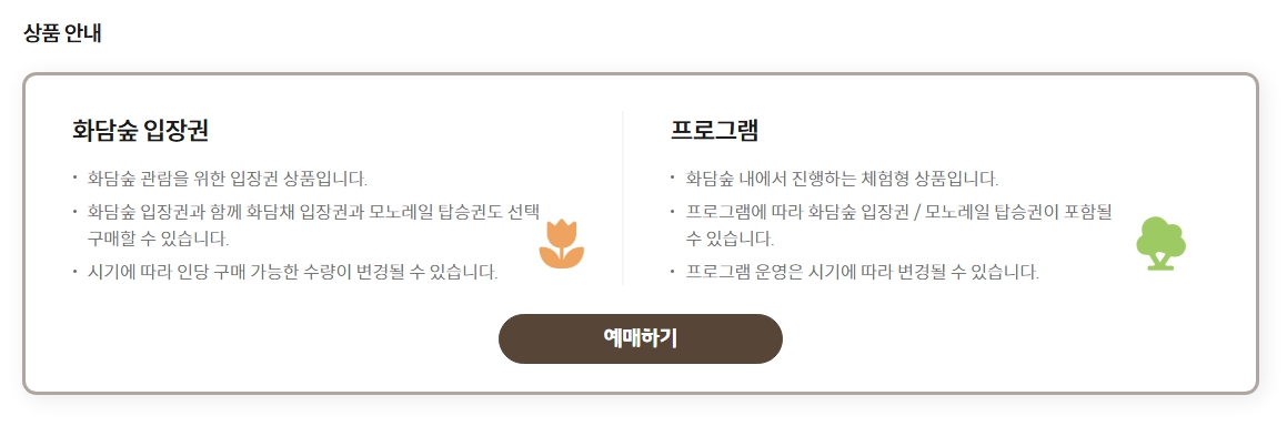 - ② 입장권, 화담채, 모노레일, 프로그램 상품 중 선택