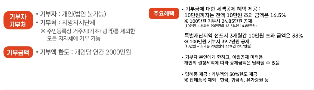 - 혜택: 세액공제 및 답례품 제공(기부금의 30% 이내)