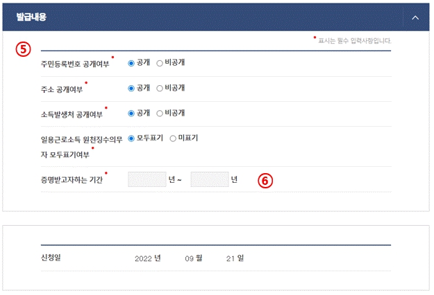 - 로그인 후 발급 연도, 제출처, 국문/영문 여부 지정