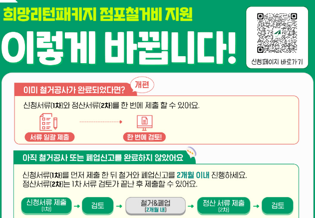 제2차 수정공고를 통해 점포철거비 지원 한도가 최대 600만 원으로 상향되었습니다. 기존보다 200만 원 늘어난 지원금은 폐업 과정에서 발생하는 비용 부담을 보다 실질적으로 완화하고, 재기 준비를 촉진하는 효과를 기대할 수 있습니다.