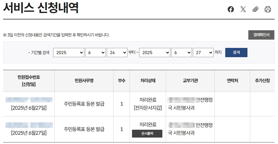 정부24 마이페이지에서 과거 발급 내역을 확인할 수 있으며, 필요한 경우 같은 설정으로 다시 발급할 수 있습니다. 단, 열람 이력은 저장되지 않으므로 발급으로 진행하는 것이 더 유리합니다.