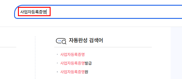 상단 통합검색창에 ‘사업자등록증명’ 또는 ‘사업자등록증명원’을 입력하면 국세청 연계 민원 항목이 표시됩니다. 유사 명칭의 다른 민원(예: 납세증명 등)과 혼동하지 않도록 정확한 항목을 선택하십시오.