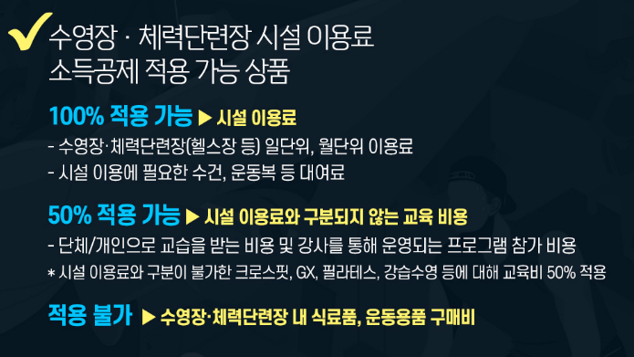 이제는 국민 건강 증진을 위해 자주 이용되는 헬스장과 수영장도 포함되며, 실질적인 생활 속 체육비용까지 세제 혜택을 받을 수 있게 되었습니다.