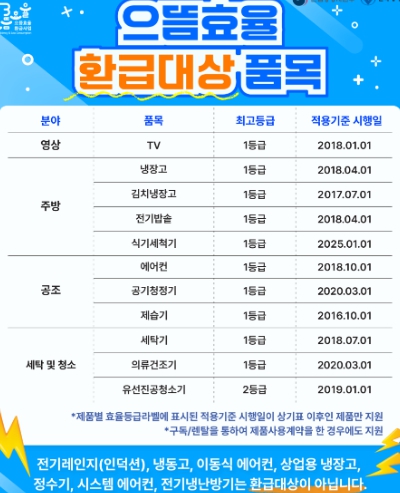 소비자는 단기적으로는 구매 비용의 일부를 환급받아 경제적 부담을 덜 수 있으며, 장기적으로는 전기요금 절감 효과를 누리게 됩니다. 고효율 제품은 초기 가격이 다소 높더라도, 환급금과 전기요금 절약분을 합치면 결과적으로 더 경제적인 선택이 될 수 있습니다.