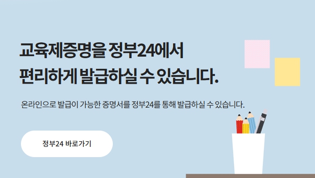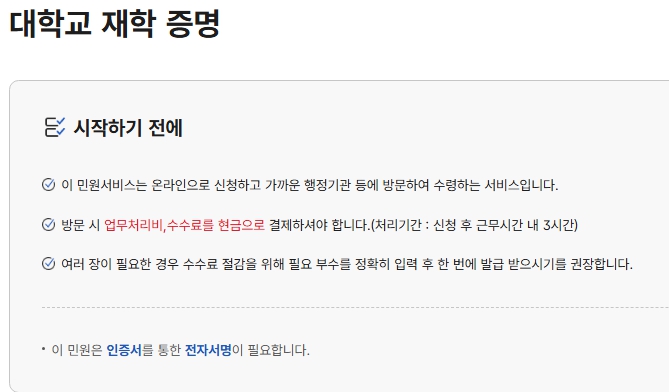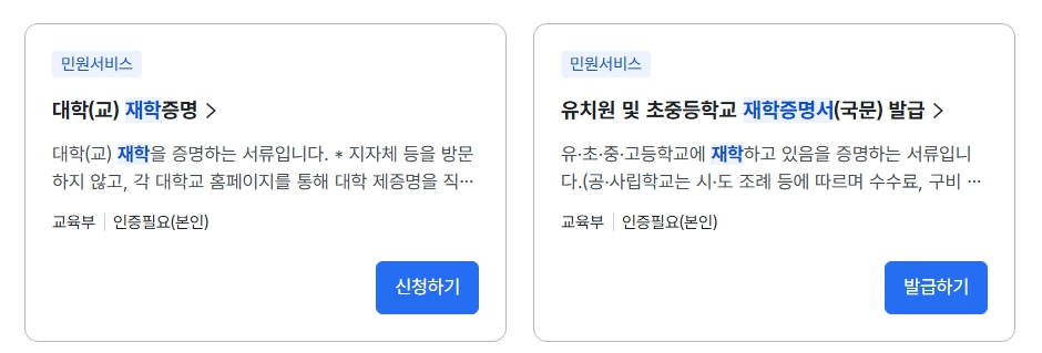 일부 대학은 정부24에서도 발급을 지원하므로, ‘대학교 재학증명’ 항목이 있는지 함께 확인하는 것이 좋습니다.