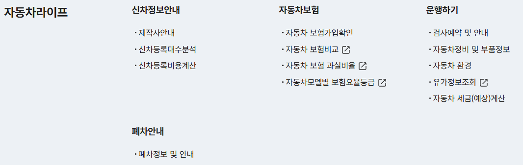 - 자동차365 홈페이지 접속 후 상단 메뉴에서 원하는 서비스 선택