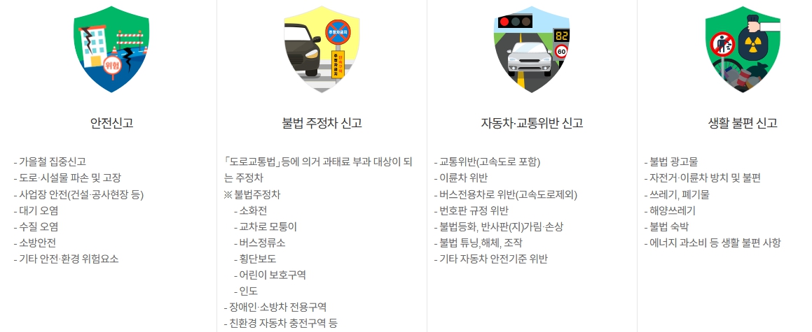 별도의 복잡한 절차 없이 웹사이트나 모바일 애플리케이션을 통해 언제 어디서나 신고할 수 있습니다. 사진·동영상 첨부과 위치정보 전송 기능을 통해 현장 상황을 명확히 전달할 수 있어, 담당 기관의 신속한 판단과 조치로 이어지기 쉽습니다.