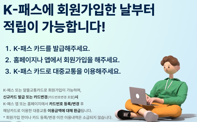 K패스 공식 누리집 또는 모바일 앱에 접속해 회원가입을 진행합니다. 휴대전화 본인확인 절차가 필수이며, 기본 인적사항과 거주 지역 정보를 입력해야 합니다.