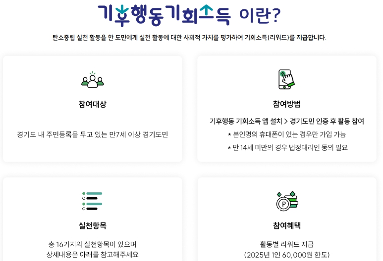 기후 위기는 더 이상 먼 미래의 이야기가 아닙니다. 우리가 일상 속에서 실천할 수 있는 작은 변화들이 지구를 살리는 큰 힘이 됩니다. 이에 경기도는 도민이 자발적으로 친환경 행동을 실천하고, 이에 대한 보상을 받을 수 있는 ‘기후행동 기회소득’ 제도를 운영하고 있습니다.