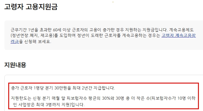 만 60세 이상 근로자를 새롭게 채용하고 일정 기준 이상의 고용기간을 유지한 경우, 인건비 절감을 위한 일정 금액이 지급됩니다. 지원금은 사업장의 규모 및 근로형태에 따라 차이가 발생합니다.