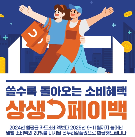 상생페이백은 만 19세 이상 국민을 대상으로 월별 카드 사용액이 전년 월평균보다 증가하면 그 증가분의 20%를 디지털온누리상품권으로 환급해 주는 소비 진작 정책입니다.