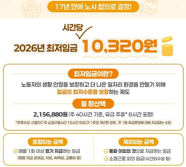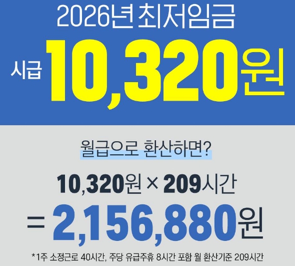 2026년도 최저시급은 10,320원으로 결정되었으며, 전년보다 인상된 금액으로 고시되었습니다. 주 40시간을 기준으로 월 209시간을 적용하면 환산 금액은 약 2,156,880원 수준으로 산정됩니다.